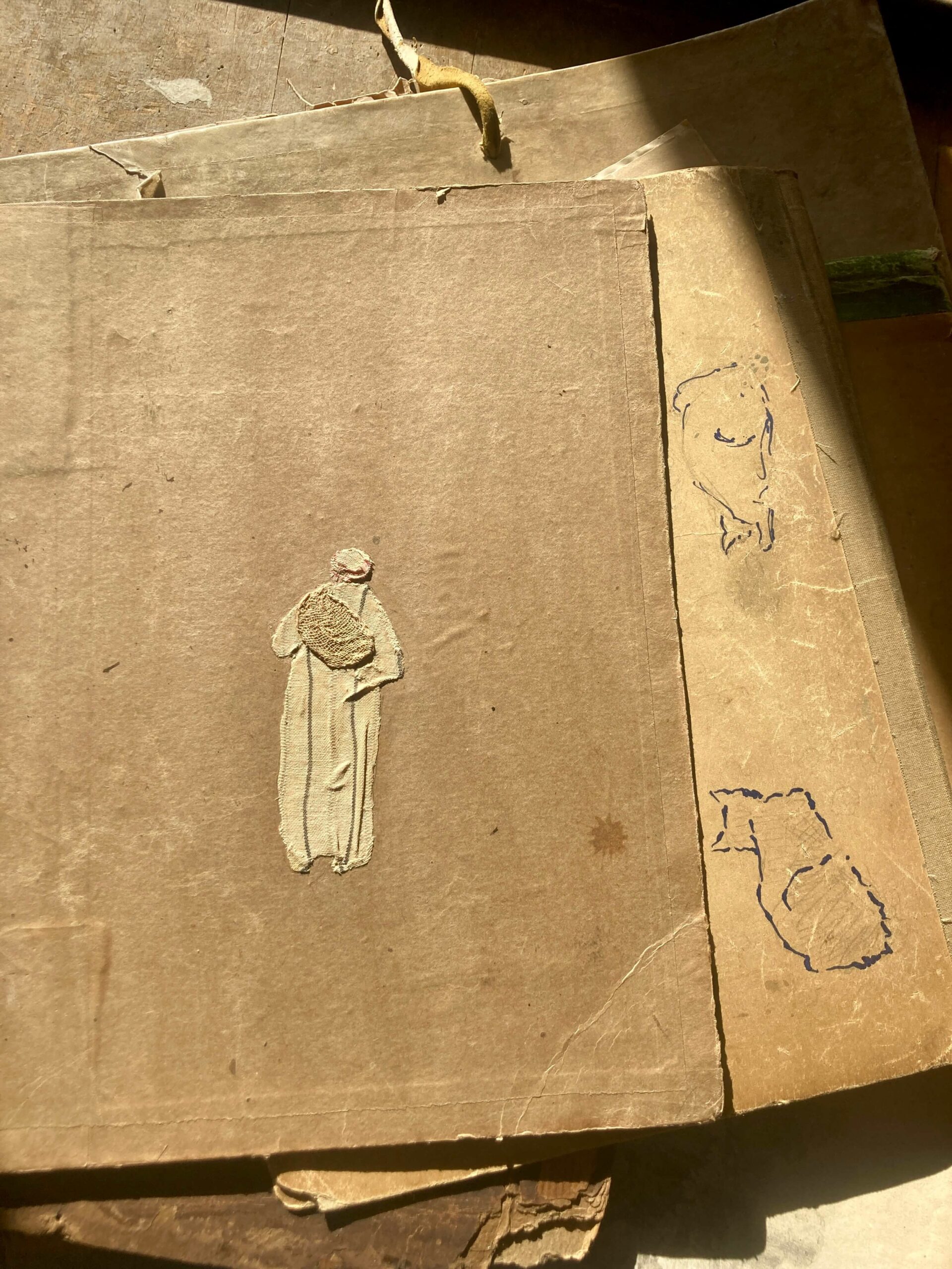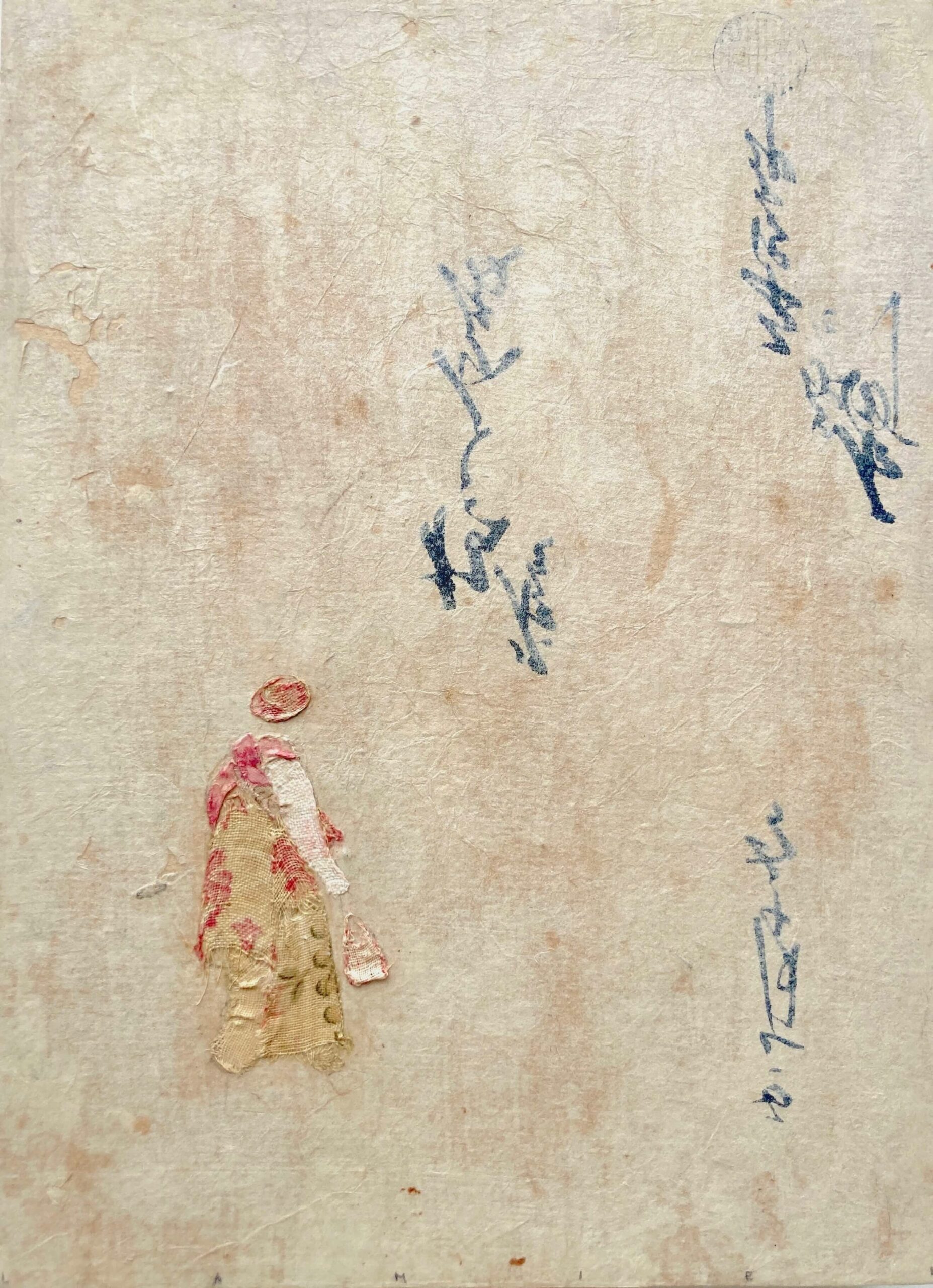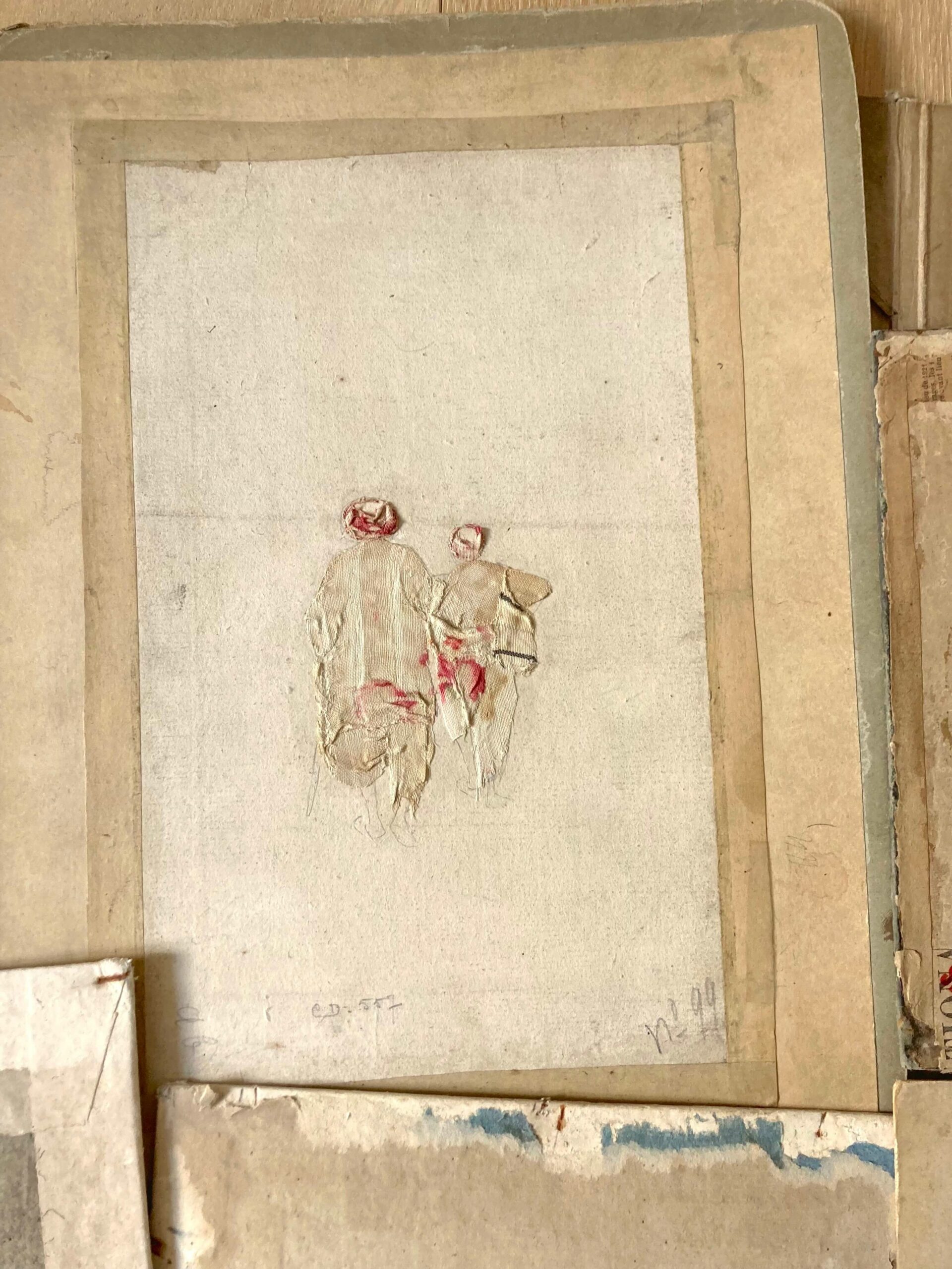 De ses voyages naît un lien viscéral à la matière : l’argile d’abord, dans sa pureté minérale, lui offre un premier souffle, un dialogue essentiel avec la terre ; puis ce rapport à la matière s’enrichit : papiers et tissus anciens, patiemment chinés et collectés, deviennent fragments d’histoires silencieuses qu’elle assemble, détourne, révèle, tissant entre leurs fibres le fil d’une parole intime.