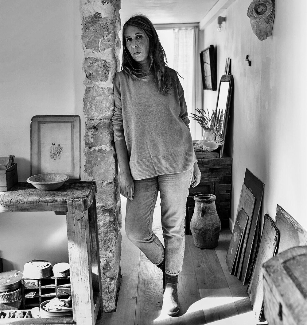 Dans son atelier parisien, Lamiel redonne vie aux fragments du passé : papiers tachés, jaunis, piqués de différentes nuances et textures, tissus et livres anciens – ce sont ses terres.